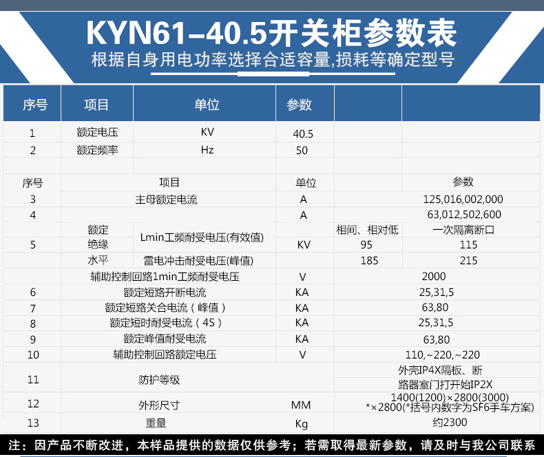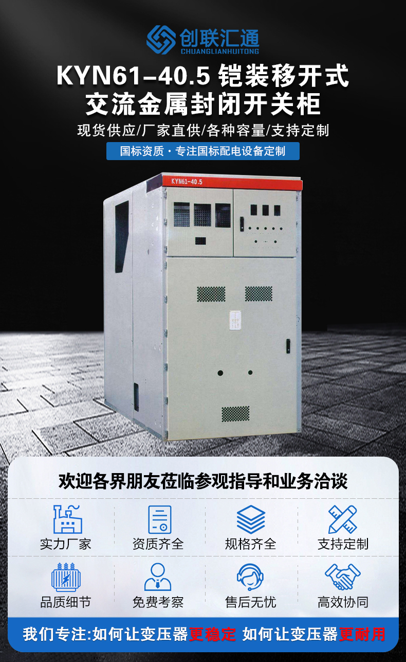 KYN61-40.5型鎧裝移開式交流金屬封閉開關柜系三相 交流50Hz,額定電壓40.5kV的戶內成套配電裝置。作為發(fā)電廠、變電站及工礦企 業(yè)接受和分配電能之用。對電路起到控制保護和檢測等功能,還可用于頻繁操 作的場所。本開關符合GB/T11022、GB3906及DL404等標準。