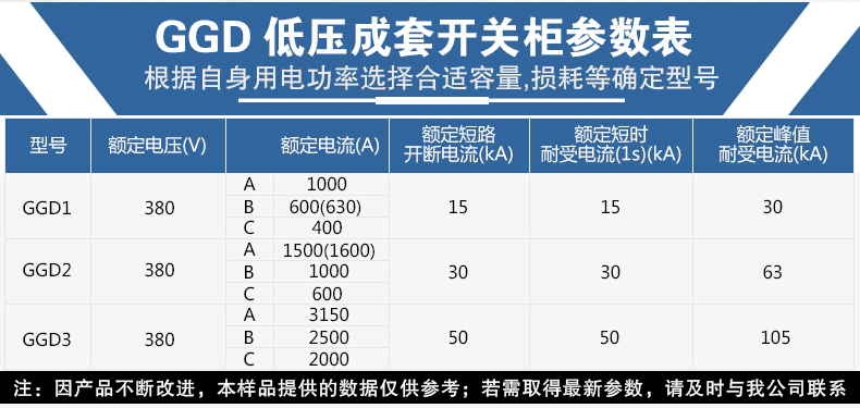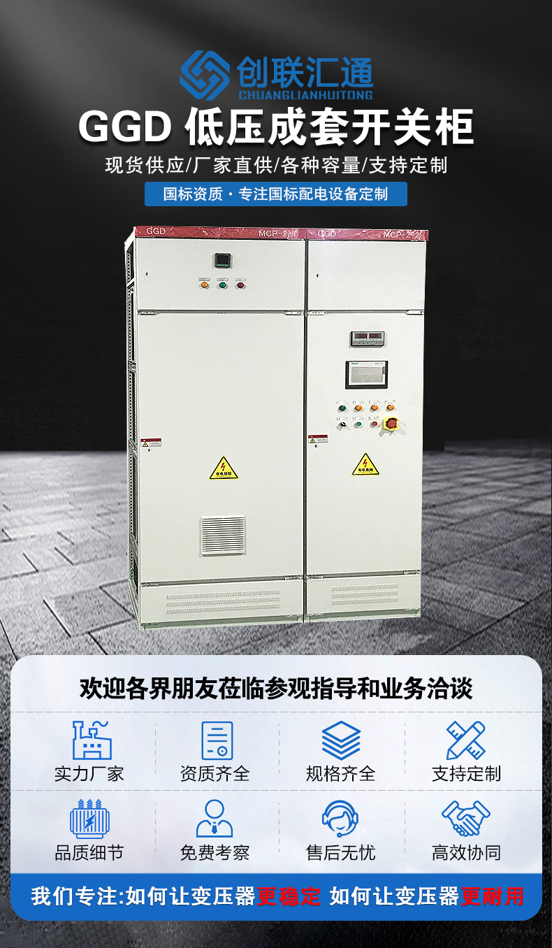 GGD型交流低壓配電柜適用于交流50Hz,額定工作電壓380V,額電工作電流至3150A的配電系統,可用于發電廠、變電站、工礦企業等電力用戶作為動力、照明及配電設備的電能轉換、分配與控制之用。