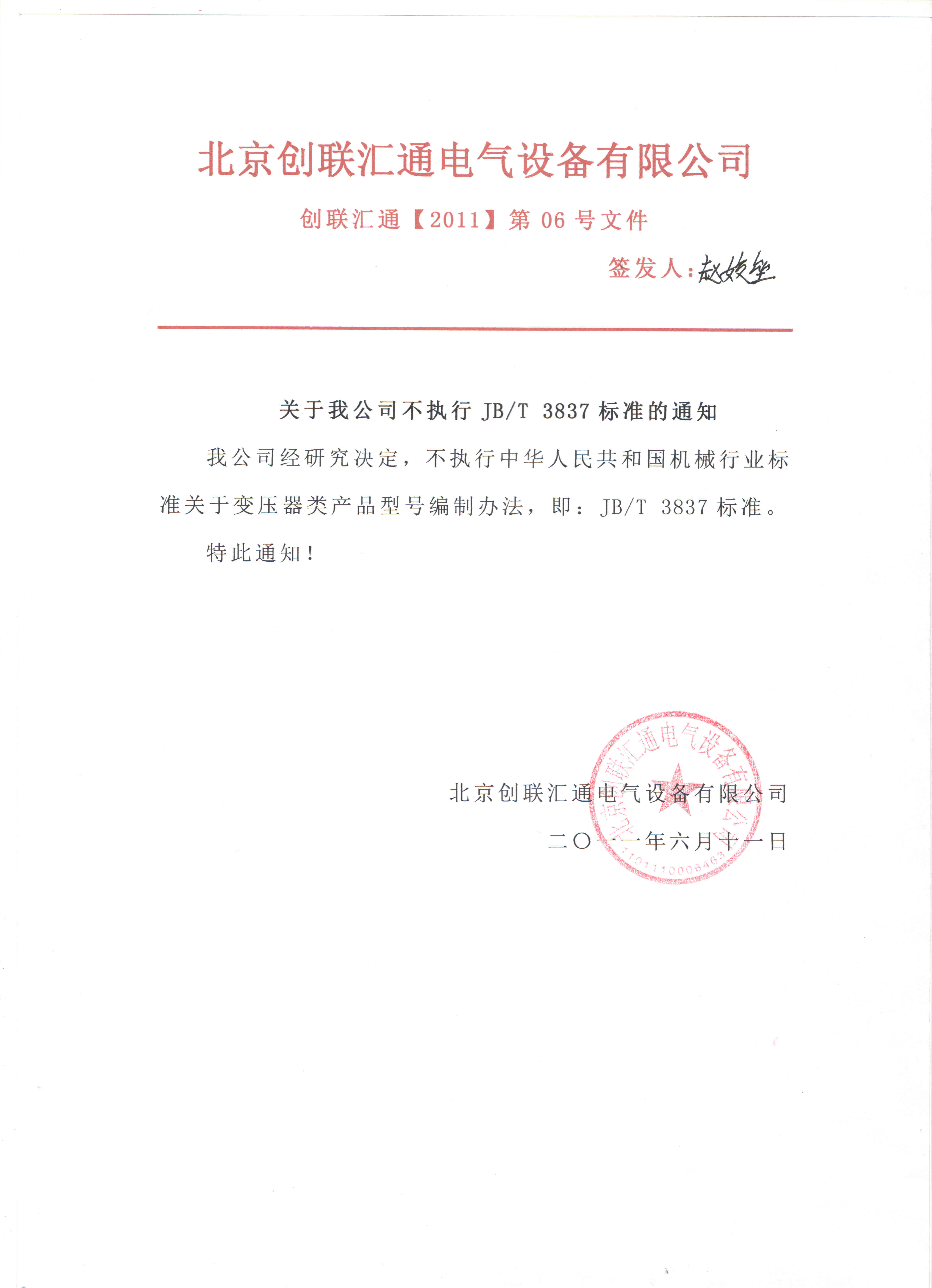 導(dǎo)讀:我公司經(jīng)研究決定,不執(zhí)行中華人民共和國機(jī)械行業(yè)標(biāo)準(zhǔn)關(guān)于變壓器類產(chǎn)品型號編制辦法,即:JB/T 3837標(biāo)準(zhǔn)。