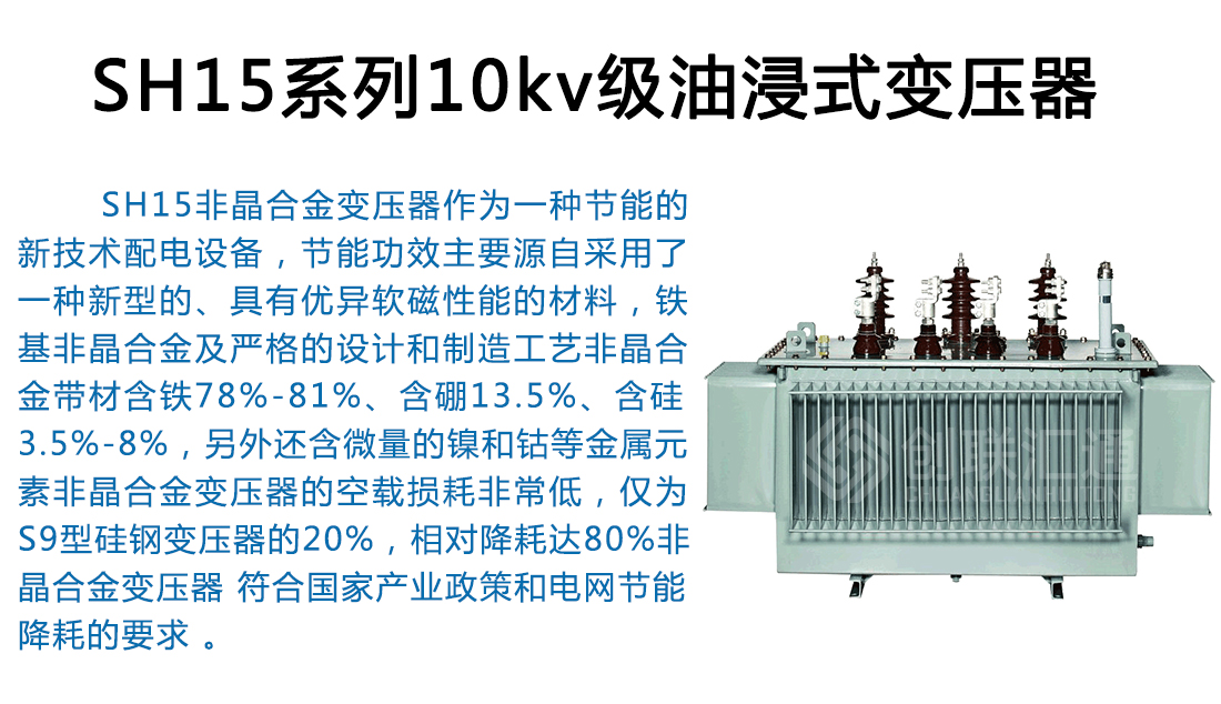 SH15非晶合金變壓器作為一種新一代節(jié)能產(chǎn)品,可以普遍適用于住宅小區(qū)、學(xué)校、工礦企事業(yè)單位以及社會(huì)公共設(shè)施。可在戶內(nèi)(外)使用,容量在315kVA 及以下時(shí)可安裝在桿上,海拔高度不超過1000m。