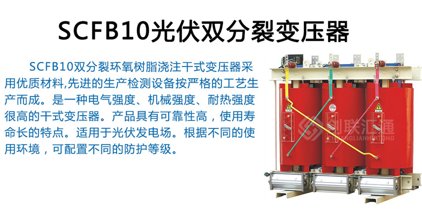 SCFB10雙分裂環氧樹脂澆注干式變壓器采用優質材料,先進的生產檢測設備按嚴格的工藝生產而成。是一種電氣強度、機械強度、耐熱強度很高的干式變壓器。產品具有可靠性高,使用壽命長的特點。適用于光伏發電場。根據不同的使用環境,可配置不同的防護等級。